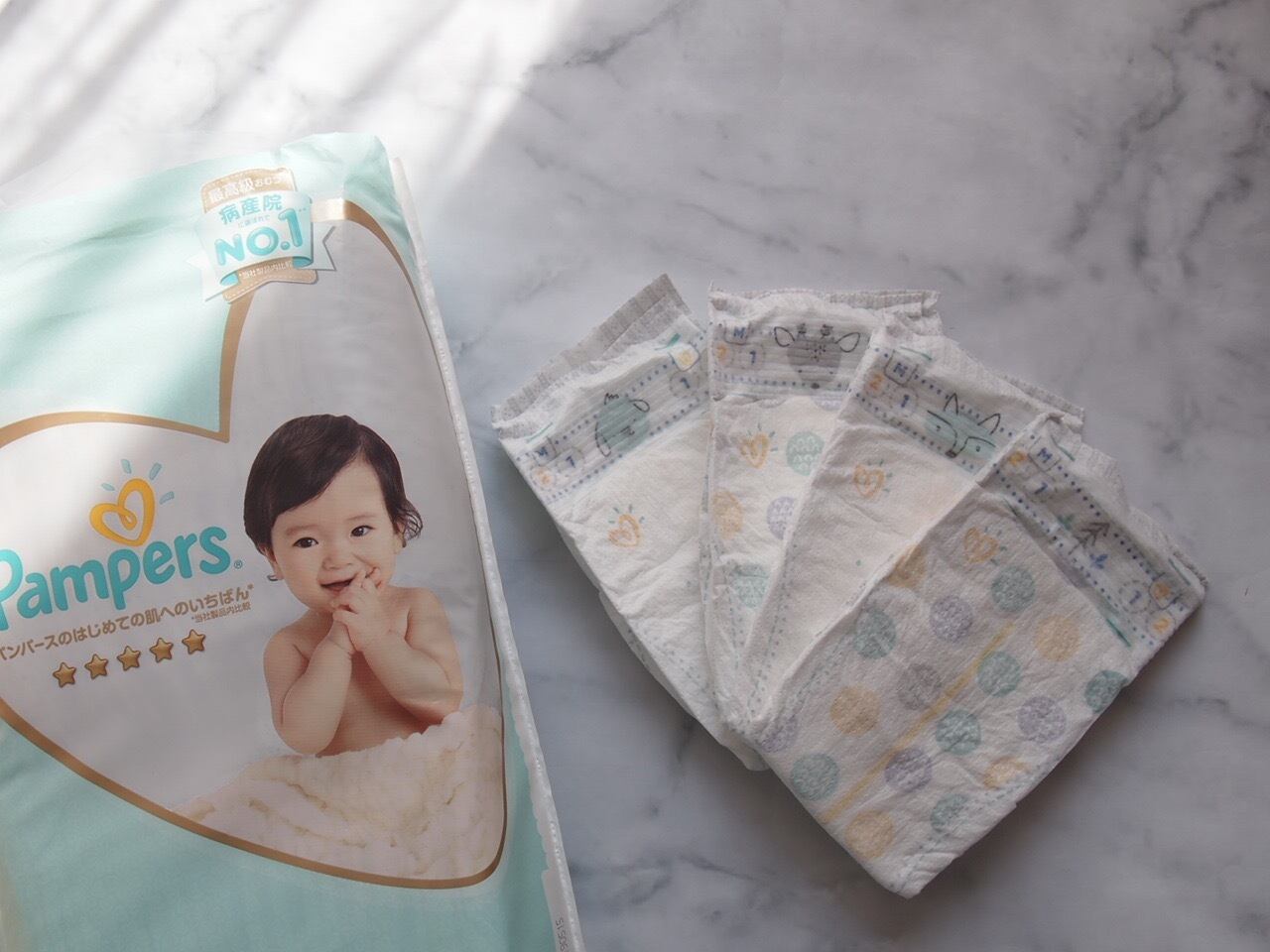 おむつは最高級パンパースSテープ(4-8kg)を24枚使用しています。(※Mサイズにも変更可能です。)